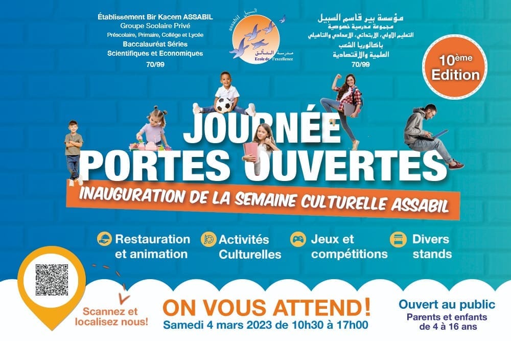 La Semaine Culturelle Assabil 2023 est pour bientôt… L’affiche gagnante sera choisie, ce vendredi 24 Février, par les membres du comité d’organisation. Une ou un élève laissera sa trace dans l’Histoire de la Semaine culturelle d’Assabil. Quant à l’ouverture de cet évènement, l’affiche ci-dessous est exhaustive. Soyons nombreux à participer à cette journée portes ouvertes ! A cette journée d’inauguration de la Semaine Culturelle D’Assabil 2023.